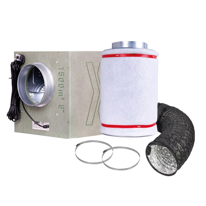 An essential kit for those just starting out, or for growers looking to update their hydroponics setup in one impressive go. Weve considered top quality and noise reduction when putting this together: our combination of 8" box fan, 8" carbon filter, and 5m ducting are capable of exchanging up to 1500m/h of cool and pure air into a grow room. Comprehensive kit Selected for their high quality and ease of use, this is a combination of our customers most-loved products. Abox fanis a staple in grow rooms of all sizes for providing cool air, and our choice of the Vortex delivers first-class results up to 1500m/h. TheMammoth Carbon Filteris a powerful odour remover which outperforms its competitors at almost half the weight.Our combi ductingis a versatile choice for its noise silencing properties, flexibility, and durability in outdoor conditions. Regulate temperature Not only will the equipment remove stale air and odours from a grow space, its useful in regulating temperature. Plants that fluctuate too wildly between temperatures can become stressed or develop mildew. A clean, reliable air supply is one of the most vital points in keeping plants healthy. Monitor your plants and ensure they stay consistent with a clean, reliable air supply. Silent operation With a super-quiet motor encased in MDF wooden panels, the Vortex box fan offers total protection against noise. The carbon filter comes with a sound insulating sleeve included, designed to further muffle any air travelling through. Used together, the products will absorb noise input to an impressive degree and save the headache of a noisy grow space. How to use Mammoth Fan Kit? Cut the aluminium ducting to your desired length. Push it from outside into your grow space, i.e. through a hole in the grow tent. Hang with bungee cords or your grow tents hanging straps. Use the attached mounting bar to fix the fan to the wall or ceiling of your grow tent with cable ties. Make sure that the intake is facing towards the front of the tent. Next, attach the aluminium ducting to the other end of your fan. Slide the metal duct clamps (included) onto the end of the ducting, and secure to the exhaust on the back of the fan. Tighten the clamps with a screwdriver. Make sure the other end of your ducting is positioned outside of the grow space. If desired, attach the carbon filter to the fan to neutralise odours. Where to use Mammoth Fan Kit? This fan kit is recommended for indoor grow spaces which need cooling or extraction, such as grow tents. The Vortex box fan included comes with an 8m power cable, so youre free to place the equipment anywhere within your grow room. Why choose Mammoth Fan Kit? Together, this kit provides all thats needed for a failsafe hydroponics setup for growers of any level. Its a one-stop purchase that will have your grow room up and running in hours! The box fan, carbon filter, and ducting included will maintain the optimum environment for your plants, whilst operating in silence: the best equipment is the kind you forget is there. Mammoth Extraction Fan Kit; Contains Vortex Box Fan; Mammoth Carbon Filter; Combi Ducting and Clamps; Moves and purifies immense quantities of air; Designed for total noise input absorption; Suitable for growers of all levels. Items Included: 1x 8 Vortex Acoustic Box Fan 1x 8 Mammoth Carbon Filter 1x 5m Vortex Combi Ducting 2x 8 Ducting Clamps Product Specifications: Brand: Mammoth Filter Diameter: 8 Filter Material: Aluminium, RC 48 Carbon Ducting Length: 5m Ducting Type: Combi Ducting Material: Aluminium, Polyester Fan Material: MDF Fan Diameter: 8 Fan Output: 1500m/h Clamp Diameter: 8 Fan Diameter: 8 Fan Output: 1500m/h Clamp Diameter: 8