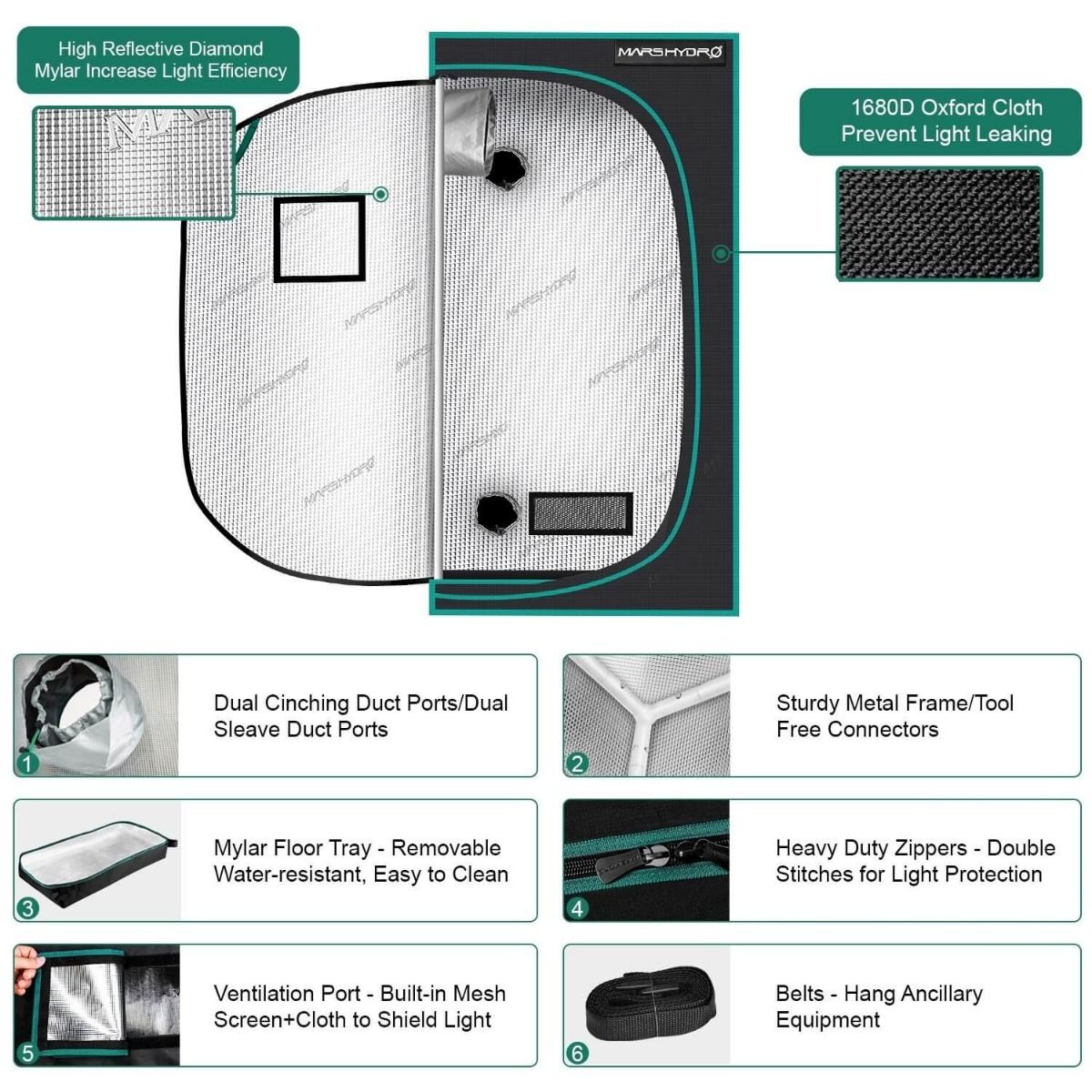 Mars Hydro 27''X27''X63'' indoor grow tent applies 1680D Oxford cloth together with heavy-duty zippers to stop light leakage, capable of maintaining 1-3 plants within a variety of empty spaces in the house, for example, closets, cabinets, balconies ... typically used as a separate nursery for seedling and veg room. Sturdy And Long Lasting Indoor Grow Tent: With an iron structure together with steel corners that support up to 110LB, Mars Hydro grow tents will not rust, neither tip over nor be crushed. Exclusive And Perpetual Grow Space: Mars Hydro grow tents offer a specific area for cultivators to grow preferred plants across the year without stressing over seasons or weather. Easy To Use Ideas: Mesh window for easy observation, detachable floor tray for practical maintenance, as well as circular vent holes with flexible nylon belts for a better installment of circulation systems. No Light Leak And High Reflectivity: Mars Hydro indoor grow tents use 1680D tear-proof canvas and carefully stitched zippers to hold all light inside, avoid light leaking. Rise Light Intensity: Highly-reflective diamond internal mylar is able to reflect light to the whole plant and enhance the light intensity by 25%, assisting yield more than without a tent. ?? ?? ?? ??