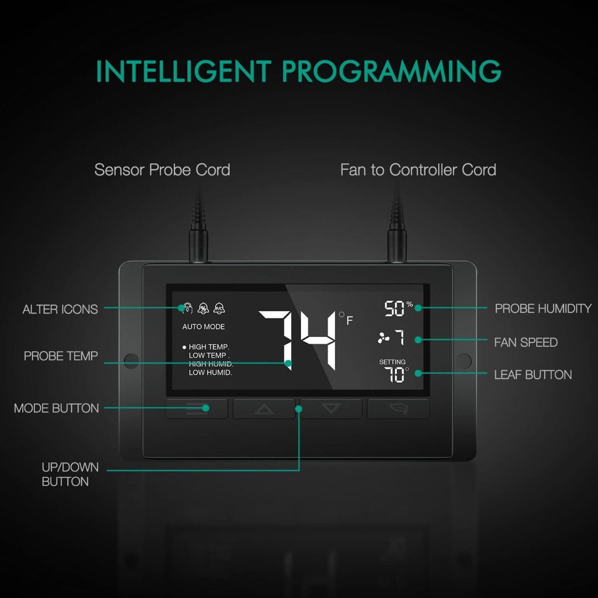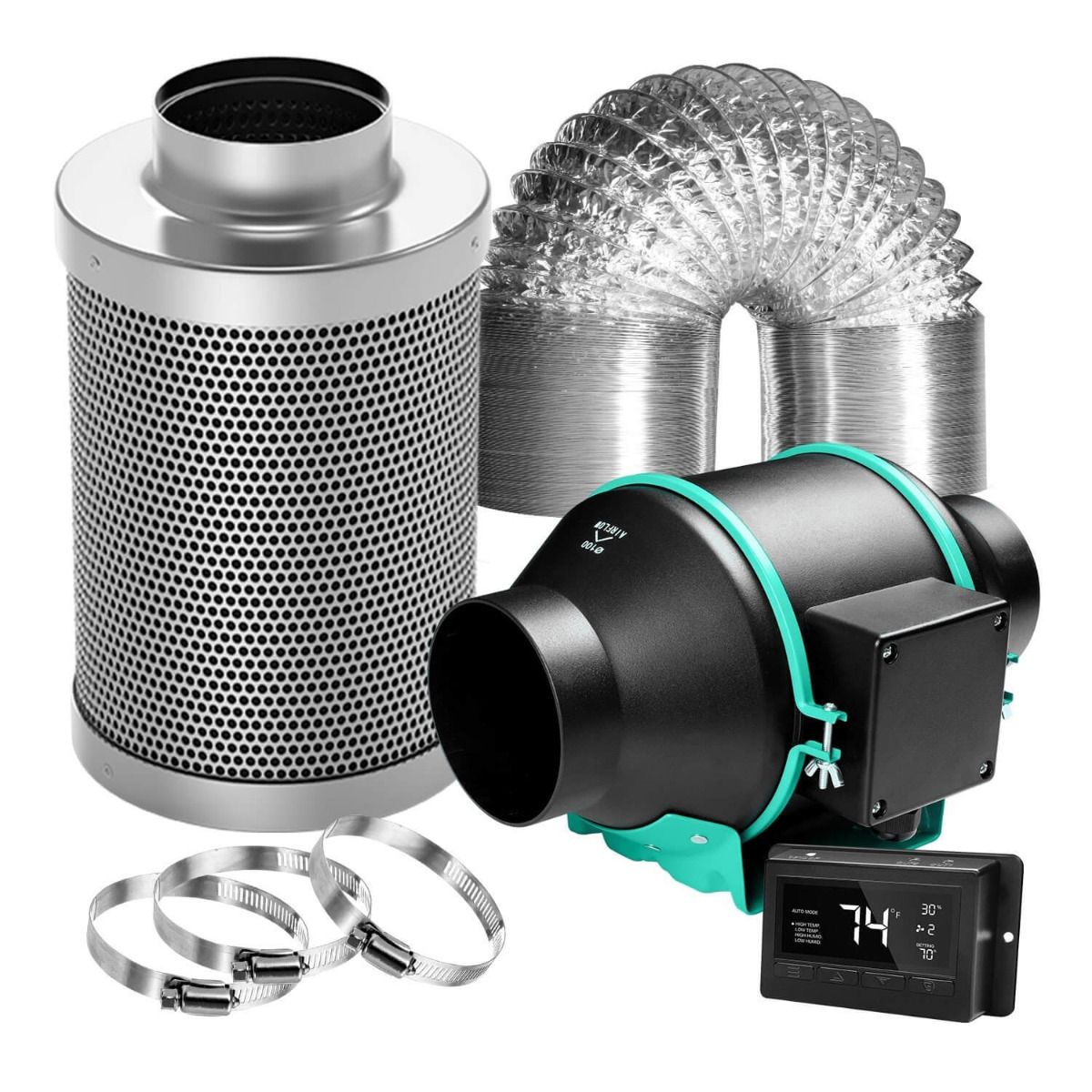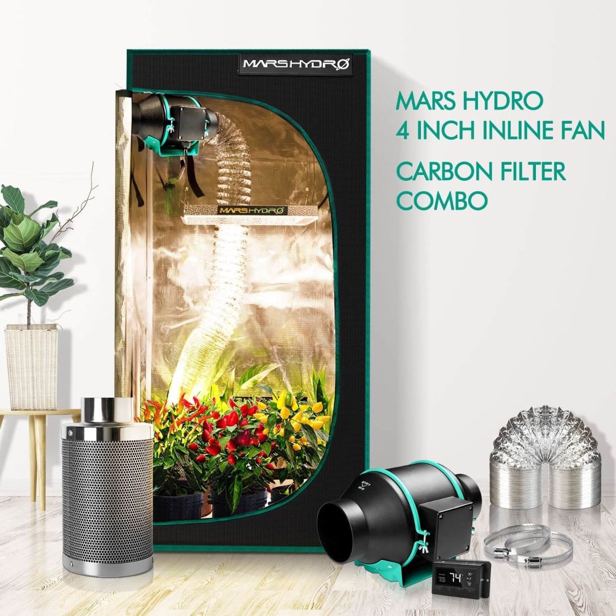 Refreshing Your Grow Room: Mars Hydro inline fan and filter kits are designed to quietly ventilate indoor grow rooms/tents, transfer heating/cooling air in and out, and eliminate odors. Kits Include: 4'' Inline Duct Fan / 4'' Carbon Filter / Thermostat Controller/ Flex Ducting / Duct Clamps Quiet Operation and Powerful Ventilation: With a PWM-controlled motor and mixed-flow design, the Mars Hydro 4'' inline fan delivers airflow up to 205 CFM and operates quietly Keeps the Air Fresh: The filter core is made of activated carbon imported from Australia, bringing 100% fresh air into the grow room and eliminating bad odors, harsh tastes, and particles. Intelligent Control: High/low temperature/humidity sensor will automatically alert by sensor probe. Controller lockout feature to prevent accidental triggering. Automatic control of fan on/off and speed to achieve TEMP/HMD settings. Duct Size : 4 | Filter Size: 4 | Airflow: 205 CFM | Noise: 26 dBA | Duct Length: 33FT ?? ?? ??