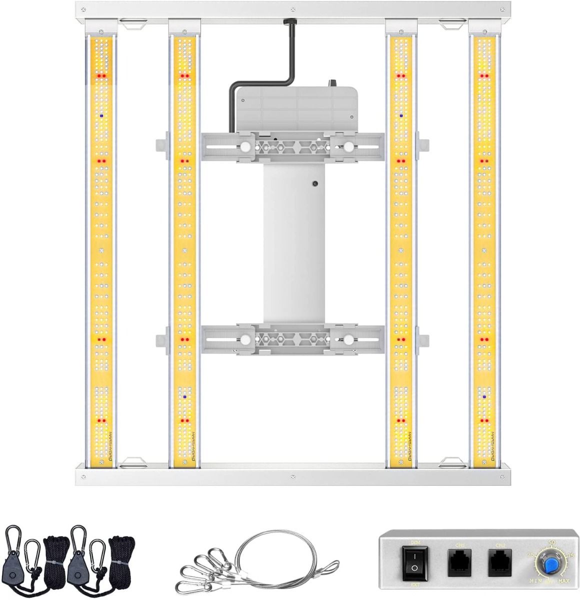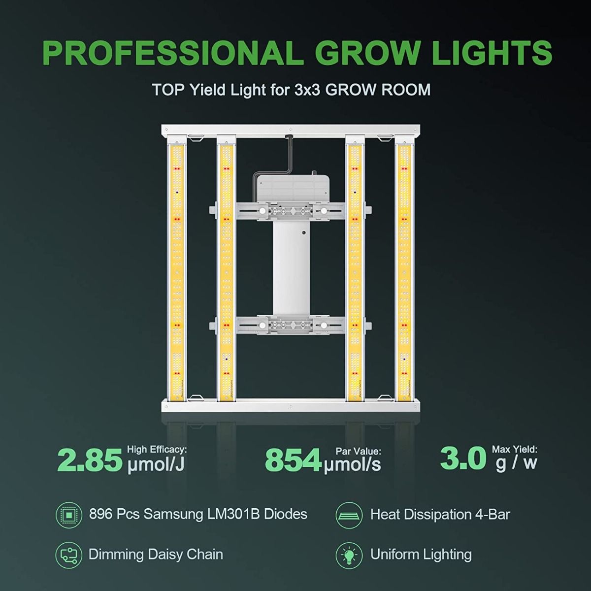 Samsung-powered FC3000 LED grow light is advised for home cultivation like tent grow. Together with specialized white spectra that are rich in red and blue wavebands, FC3000 utilizes a uniform photon distribution to obtain an even PPID and premium PPF across the plant canopy. Wattage - 300w Veg Coverage - 3'x3' Flower Coverage - 2.5'x2.5' The overwhelming choice for most growers applying in grow tent, small room, cabinet & closet, and plant shelves. Super High Quality LED Chips: The FC3000 is made up of 896 pcs Samsung lm301B, resulting in an efficiency of 2.85?mol/j. Twice as many LEDs as comparable lights, driving the grow lights at low current and effectively avoiding overdrive. High PPFD Output and Even PAR Distribution: The multi-light bar design and the dense distribution of the grow light chips facilitate an even distribution of PAR. Optimal PPFD values for plant growth are achieved in every corner of the effective coverage area. Exclusive Design of the Spectrum: The full spectrum is enhanced with blue and red light. The rich blue light promotes plant growth and the abundant red light improves the yield and quality of the plants. Daisy Chain Dimming Feature: Dimming from 10 to 100% depending on the growth stage of the plant, while saving on electricity costs. The daisy chain can be connected to 30 lights at the same time from one master light. Fast Heat Dissipation: The wave-shaped heat sink dissipates heat quickly allowing cool operation. DLC Certified and 5 Years Warranty: DLC-certified LED grow lights are high quality and efficient, meeting the highest standards in the industry. No need to worry about any quality issues, the 5-year warranty, and local repair provide excellent after-sales service.