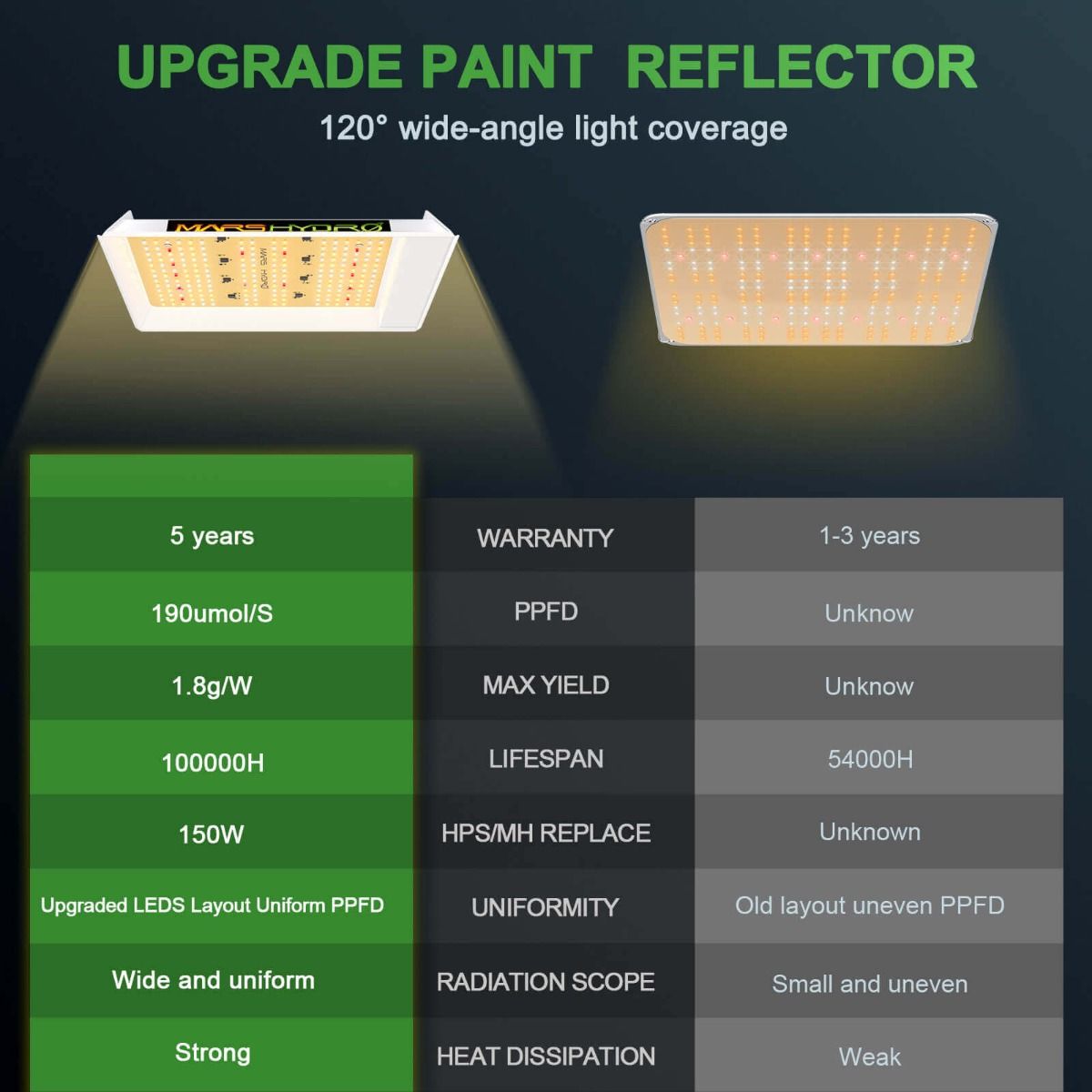 WATTAGE100W5%@AC120V, 99W5%@AC240VCore Coverage1.5'x1.5'Max Coverage2'x2'PPE2.0?mol/jPPF190umol/SChip BrandBridgeLuxLEDS QUANTITY225 pcs@120V 240 pcs@240VSpectrum660-665nm 730-740nm 3000-3200K 6000-6500KMax Yield1.8g/WDRIVER/VoltageAC110-130V?220-240VAmps1.38A@AC120V 0.80A@AC240VBTU341CertificateUKCA,CE,RoHS, ETL Lifespan 50000Hour WARRANTY 5 years Dimension356*310*36mm Reduced Energy Usage LED Grow Light: Consuming 100w as well as being installed with 225 pcs chips, TS600 is able to replace a 150w HPS light while saving 30% electric power. High Efficiency LED Grow Light: With overall light output PPF 190umol/S and good PPE 2.0 umol/j, it's 50% more photon effective so can promise a 30% more return compared to the old HPS/MH lights. Patent Reflective Hood Design: The reflector on TS600 has actually been patented, which can effectively gather the light dispersed in all directions to improve its light intensity and aid plants acquire more light absorption. Full Spectrum Plant-Preferred Spectra: By the special combination of ranges that emits most light in the 400-700nm waveband, extremely conducive to plant photosynthesis. Appropriate IR(730-740nm) is additionally included in the range to help form larger buds. Trustworthy Qualifications And Warranty: CE, ETL, RoHS, UKCA security certifications approved, 50,000 hours long lifespan, 5-year service warranty, and local after-sales solution facilities.