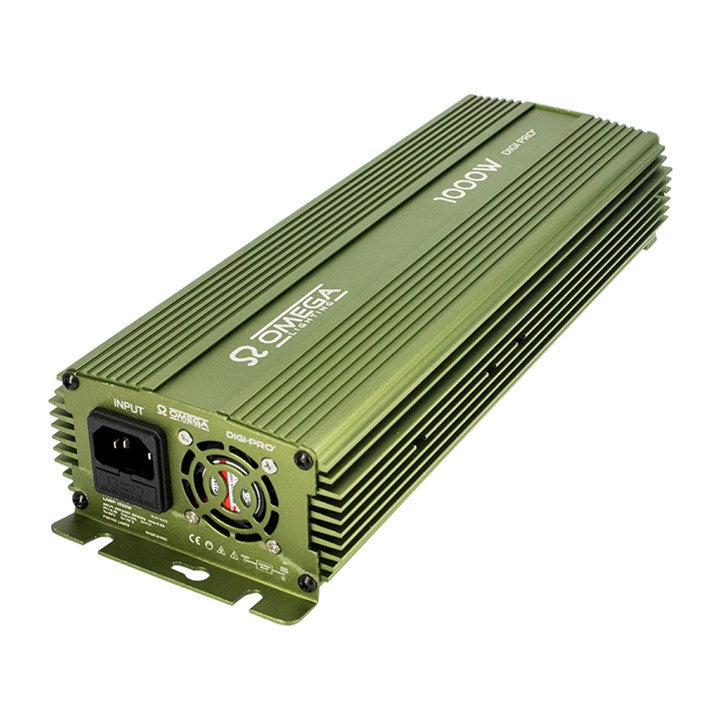 Versatility and quality performance guaranteed HID lighting is the professionals' choice for maximising crop growth. The Omega 1000W Digi-Pro Digital Dimmable Ballast is a top of the range ballast which features a unique technology allowing the user to fully control and dim their Grow Lamps. 2-year warranty New and improved Kits available Mount on wall 1000w output (240v) 10% extra super lumen technology Soft start reduces lamp flickering What is the Omega 1000w Digi-Pro Digital Dimmable Ballast used for? The Omega Digital Ballast is not the same as any dimmable ballast available on the market. These systems give growers complete versatility and performance from a single lighting system. Likewise, it will run at 1150W (super lumen), 1000W, 600W and 400W settings. The super lumen technology increases ballast output for maximum lamp performance, therefore providing the user with the best lighting possible. The Ballasts can also be easily adjusted to reduce the output of the lamp when not as much power is needed. So when running a 1000W lamp you can reduce the output to 400W or 600W. Alternatively, increase it to super lumen 1150W to give plants a healthy boost. Growers can use the 1000W Ballast alongside an Omega 1000W Eurowing Digi Kit, featuring a Eurowing Reflector, and a 1000W Dual Spectrum Lamp. Why choose Omega's Digi-Pro Dimmable Ballast? Omega Digi-Pro Digital Dimmable Ballasts are the most economical solutions for controlling powerful light sources. This is because they do not create any resistance and produce next to no heat or noise. Not only are they an energy-efficient unit, but they also create a higher PAR output. All ballasts feature a 1-meter mains lead and are easy to position on walls using the wall mount. The Omega 1000W Digital Dimmable Ballast runs fairly cool in use, however, users should still place it on a flat surface. To use simply connect the input lead of the reflector to the output lead of the ballast. Use the power-output switch to select the desired output wattage. Omega 100W 240V Digi-Pro Ballast Specifications Technology: Digital Rated Power: 1000W Lamp Type: 1000W HPS Rated Input Voltage: 220-240V AC Voltage Input Range: 190Vac~265Vac Input Frequency: 50Hz~60Hz Input Running Current: Max 5.0A Ignition Voltage: 3.5~5KV Required Lamp Voltage: 120V (+/- 10V) Power Factor: >0.99 Efficiency: >95% THD: <10% Dimming: 400W, 600W, 1000W, 1150W Current Crest Factor: <1.7 Output Frequency: >50KHz Protection: Full Circuit Protection Striking Distance: 15m Operating Temperature Range: -20C~+50C TA: 30C TC: 70C Case: Aluminium Alloy Length of Power Lead: 2m