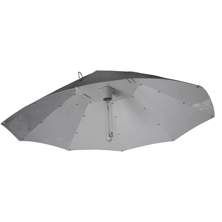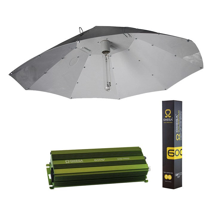 Maximise yields with Omega Vertical Parabolic Light Kit Omega Lighting Kits are regarded as the best on the market and excellent value for money.This combination package offers the user a high-performance and cost-effective lighting system. Included in the Omega Vertical Parabolic Light Kit is a high quality 600W Digi-Pro Digital Dimmable Ballast 600W Ballast, an open-ended highly polished, and lightweight Vertical Parabolic Reflector which gives an efficient and even distribution of light, as well as a high-quality 600W Dual Spectrum Lamp. Omega 600W Digi-Pro Digital Dimmable Ballast The Omega Digi-Pro 600W Dimmable Digital Ballast is the professionals choice for maximising crop growth. Omega Lightings state of the art Ballasts are ideal for powering HID lamps. They offer the user the ability to control power output to the bulb which not only protects the lifetime of the bulb, it also helps to reduce growing costs. Omega Lightings precisionengineered lamps provide anoptically superior product.Beam patterns are smootherwith striations and hot spotssignificantly reduced. Not onlyare they an energy-efficient butthey are tuned and optimisedto create a higher PAR output. Omega Lightings advancedsuper-lumen technology produces additional wattagefrom the bulb. This increasedoutput does not affect thelifespan of the bulb. The Omega Digi-Pro 600W Dimmable Digital Ballast features a unique 4-setting control which offers dimming options of 250W, 400W, 600W and a super-lumen setting of 660W. Omega 600W Dual Spectrum Lamp Omega Lighting has designed and manufactured Omega Dual Spectrum Lamps with the grower specifically in mind. Omega Lighting's advanced lamp technology features two ceramic tubes which are designed specifically to optimise light output, achieving more usable light energy, providing longer-lasting performance with consistent lumen output. By combining the latest lighting technology with our own experience, Omega Lighting Dual Spectrum Lamps are specifically designed to suit each unique stage of a plants growth. Omega Lightings technically advanced lamps feature two ceramic tubes which are designed to optimise light output. This, in turn, achieves more usable light energy, providing longer-lasting performance with consistent lumen output. The dynamics of the tube allows for heat reduction without impacting upon the lifespan of the lamp. This results in a lower grow temperature that contributes to increased plant yield. 95,000 Lumens output. A lifetime of 24,000 hours. ?? Omega Vertical Parabolic Reflectors Ideal for providing maximum and even light-coverage whilst avoiding unwanted hot spots. The Vertical Parabolic Reflector is excellent for larger growing areas and covers a wide swatch from low mounting heights. Omegas Parabolic Reflector features a wide-angled parabolic shape that can be mounted closer to plants thus increasing light levels. The large umbrella-shaped reflector is constructed from stucco galvanised reflective aluminium. The Vertical Parabolic Reflector is an excellent product for larger grow areas, supplied flat packed and easy to assemble.