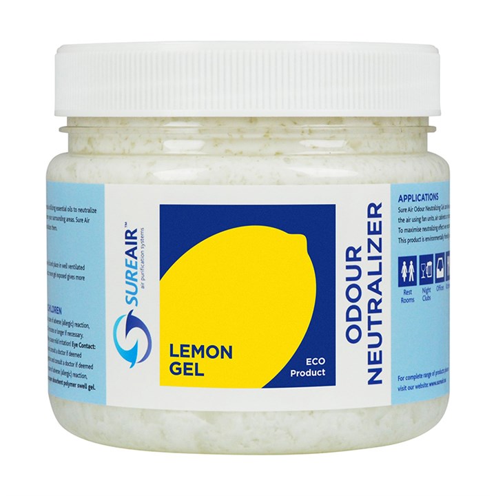 Sureair Odour Neutralising Gel Lemon 1L Sureair Odour Neutralising Gel is a complex formula utilising essential oils to neutralise a large array of organic and non-organic odours within an environment. How does Sureair Gel work? Sureair Neutralising Gel does not mask odours it neutralises them. How to use Sureair Gel Once opened, Sureair is ready to go. Simply shake and/or stir well before use. Remove the lid and place the jar in a well-ventilated area or pour into an open tray or dish. The more air that comes into contact with the gel, the more effective Sureair will be. The more exposed gel, the more neutralisation. If used constantly, one litre of gel should last at least a month. KEY FEATURES Neutralising odour instead of masking. Simply open and use Long-lasting